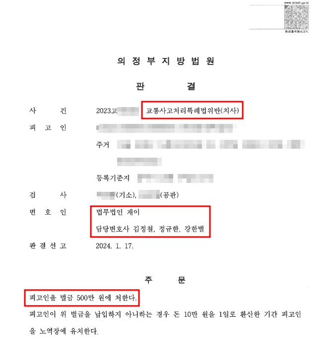 위와 같은 법무법인 재이 형사팀의 각고의 노력 끝에 사망사건임에도 불구하고 이례적으로 피고인은 벌금 500만원이라는 처분을 선고받을 수 있었습니다.