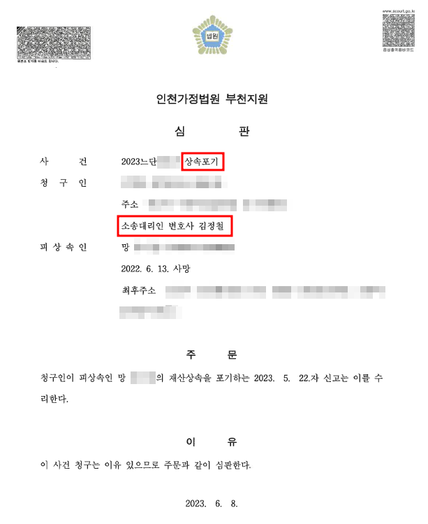 이에 법무법인 재이는 의뢰인들이 어머니 및 외삼촌 생전에 왕래한 사실이 전혀 없다는 사실과, 어머니와 외삼촌이 사망한 사실을 전혀 알지 못하였다는 사실 등을 충분히 소명하여 어머니와 외삼촌이 사망한지 3개월이 훌쩍 지났음에도 재판부로부터 상속포기 심판을 이끌어내었습니다.