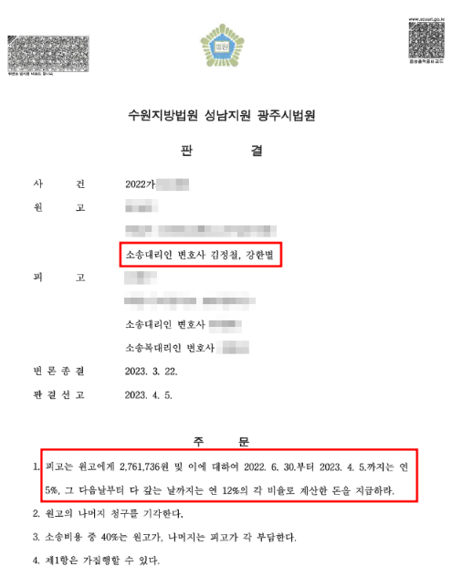 본 사안에서도 의뢰인의 상대방이 위와 같은 주장을 하였으나 법무법인 재이는 상대방의 주장을 전부 배척시켜 의뢰인이 입은 손해를 배상받을 수 있도록 조력하였고 이에 의뢰인이 만족하실 수 있는 결과를 도출하였습니다.