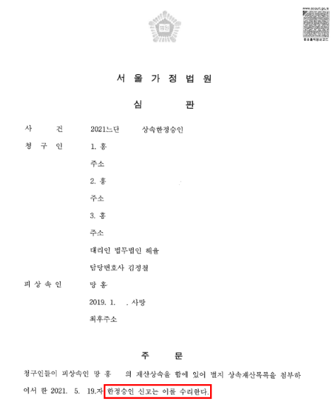 본 사안은 저희 의뢰인들이 친부가 사망한지 2년이 경과한 뒤에 비로소 친부가 남긴 상당한 채무를 알게 되어 뒤늦게 특별한정승인신고를 한 사안이었습니다.