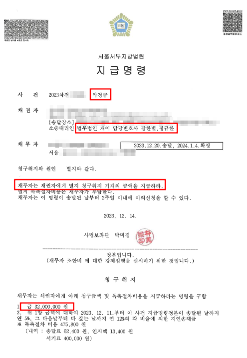 그 결과 법무법인 재이는 지급명령신청 접수부터 확정까지 1달도 채 지나지 않아, 약정금원 전부에 대한 지급명령결정을 받게 되었습니다.