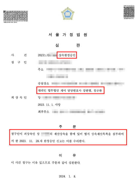 본 사안은 피상속인이 거액의 채무를 진 채로 상속이 개시되어 의뢰인들 중 일부는 위 상속재산 및 상속채무를 포기(상속포기)하고 의뢰인들 중 한 분은 한정승인을 한 사안으로 의뢰인들은 거액의 상속채무를 면하기 위하여 법무법인 재이를 찾아주셨습니다.