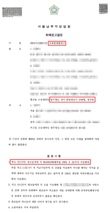 이에 피고 측도 법무법인 재이가 꼼꼼하게 산정한 유류분반환 액수를 모두 인정하였고, 재판부로부터 첫 번째 변론기일 해당 내용으로 화해권고결정을 이끌어내었습니다.