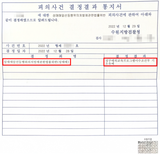 그 결과 검사는 법무법인 재이의 주장을 그대로 인용하였고 의뢰인은 아동청소년의 성보호에 관한 법률이 아닌 성매매알선등행위의처벌에관한법률이 적용되어 교육조건부 기소유예처분을 받을 수 있게 되었습니다.