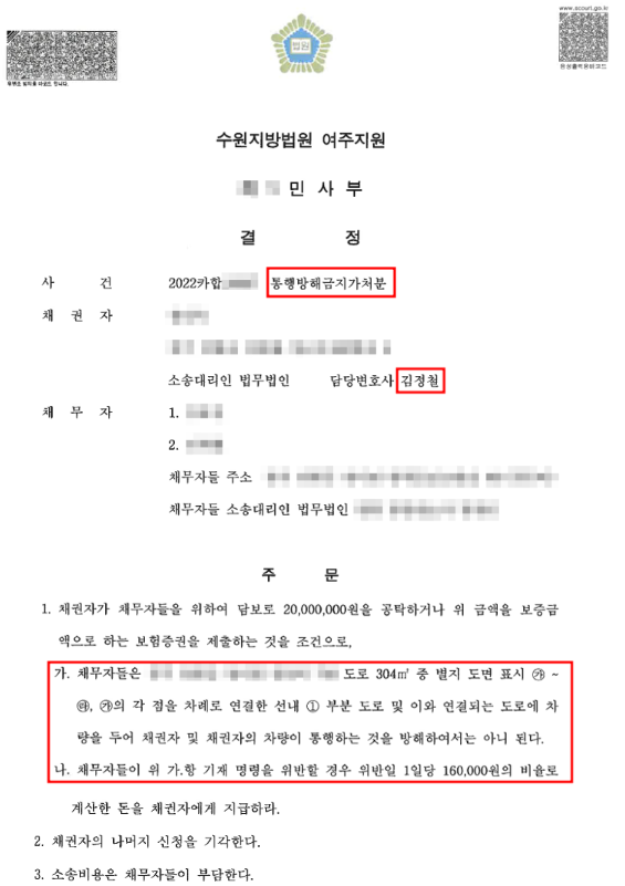 상대방은 우회도로가 있다는 점, 공사로 인한 피해를 입고 있다는 점 등을 주장하며 적극적으로 대처하였으나, 법무법인 재이는 상대방의 위와 같은 주장에 대해서도 소상히 반박하여 재판부로부터 통행방해금지 가처분 인용결정을 이끌어 내었습니다.
