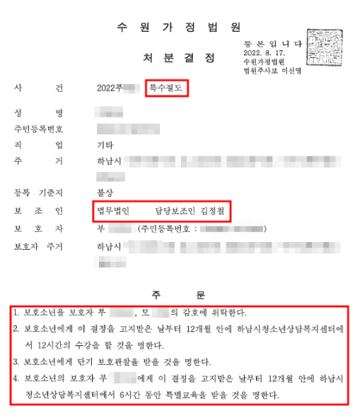 의뢰인께서는 자녀의 장래가 너무 걱정되셔서 반드시 5호 이하의 보호처분을 받을 수 있도록 각별히 요청을 주셨습니다.