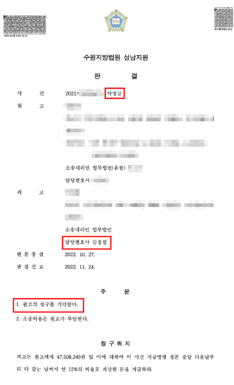본 사례는 철저한 사실관계 및 법리검토와 증거자료의 면밀한 해석을 통해 전부 승소를 이끌어 낸 사안으로서 변호사의 조력에 따라 사건의 성패가 갈릴 수도 있는 상황이었으나 법무법인 재이는 적극적인 변론을 통해 성공적으로 사건을 잘 마무리 지었습니다.