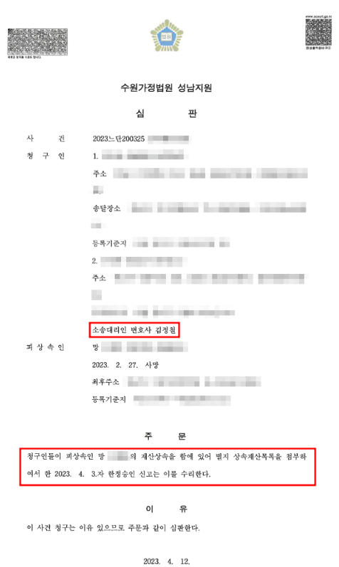 법무법인 재이는 자녀의 채무가 적극재산을 초과하는 사실을 재판부에 소명하여 신속하게 한정승인 인용결정을 받아내었습니다.
